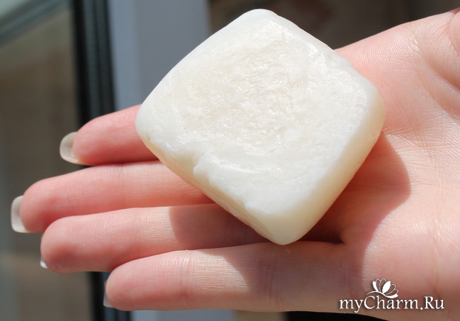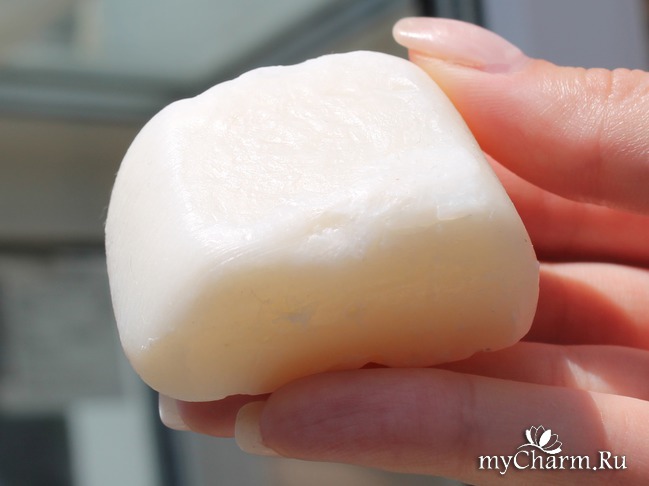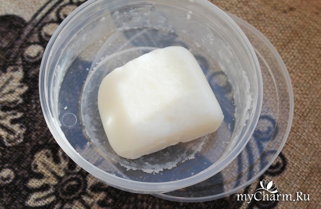 Думаю, все заметили, что этот брусок очень напоминает мыло. От себя же добавлю, что на ощупь он не такой - все-таки помягче. А если же дезодорант затвердеет, повторюсь, эту корочку надо будет срезать.