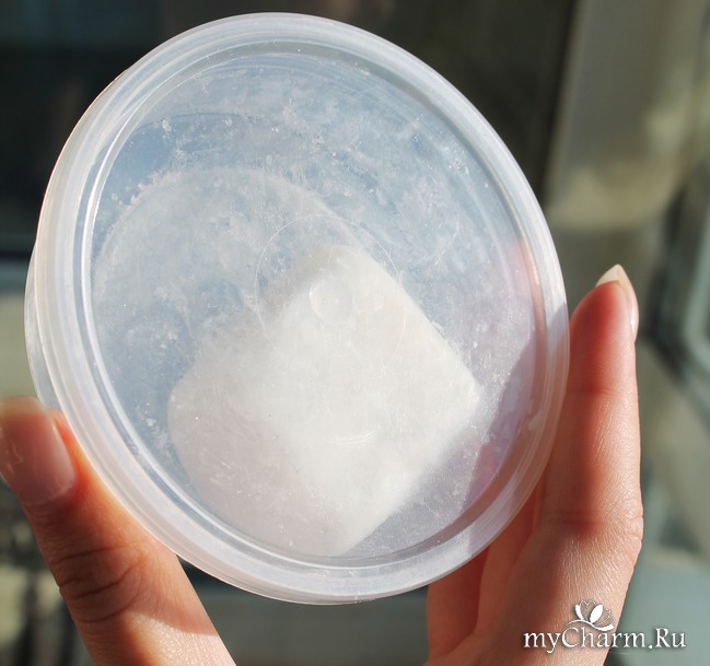 Доброжелательные девушки рассказали мне подробнее про этот волшебный брусок и отрезали кусочек ровно в 50г. А еще положили всё в круглый контейнер. Дело в том, что на открытом воздухе он постепенно засыхает и твердеет, поэтому меня предупредили, что этого допускать не стоит. В противном случае придется отрезать твердую корочку, чтобы дальше продолжить пользоваться "мягкой" частью. Я послушный пользователь - всегда плотно закрываю крышку контейнера, а потому никаких таких проблем у меня не случалось.
