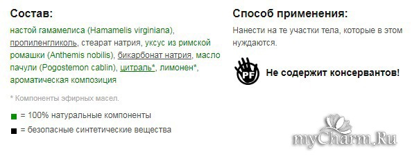 Для подробного изучения я прикладываю скриншот с официальной страницы производителя. Они очень честные - пишут, где натуральные ингредиенты (зеленые буковки), а какие компоненты синтетические (но при этом полностью безопасные). Тех самых страшных солей алюминия тут, как видите, нет. Как и консервантов, к слову.