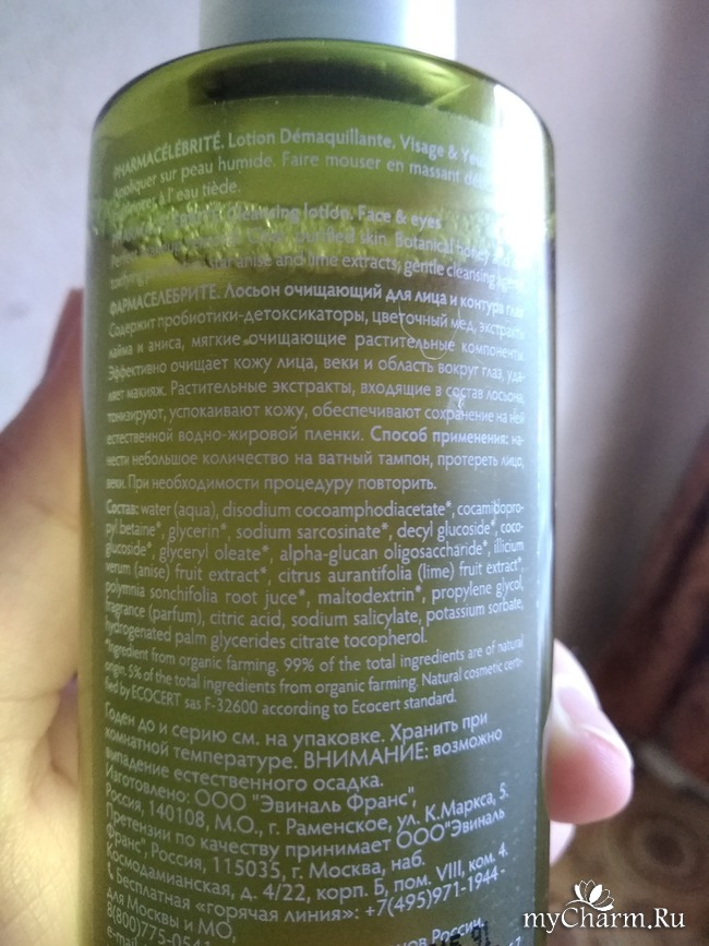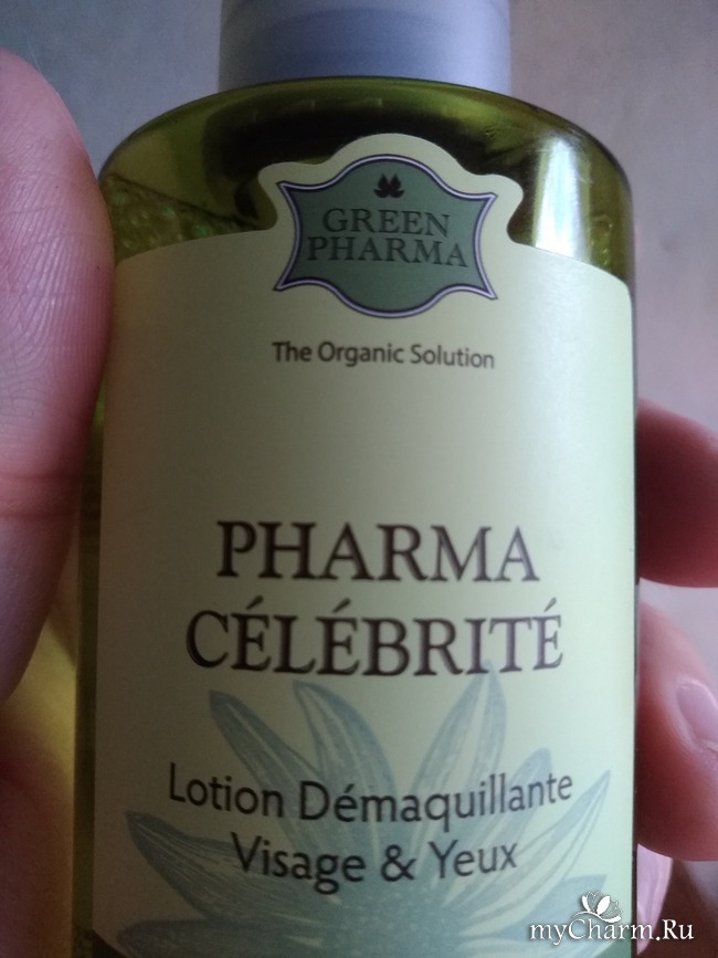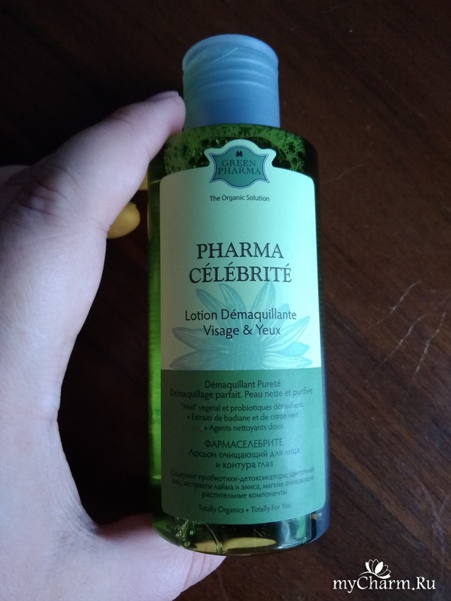 Знакомьтесь – это очищающий лосьон для лица и глаз «Фармаселебрите» от торговой марки «Green Pharma», которая принадлежит компании «Evinal France».
