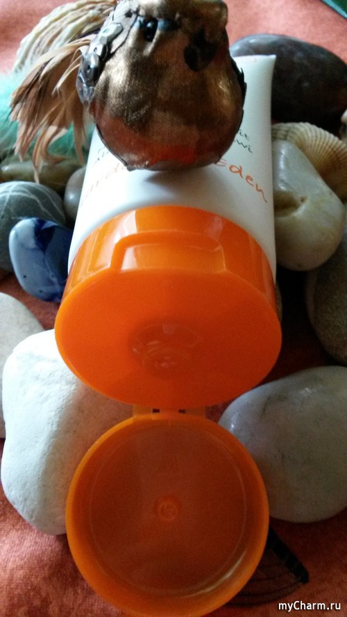 Внутри коробочки находится белого цвета тюбик из мягкой пластмассы, до того мягкой, как бархат, в руках держать одно удовольствие, тюбик закрыт ярко-оранжевым само откидывающимся колпачком.
