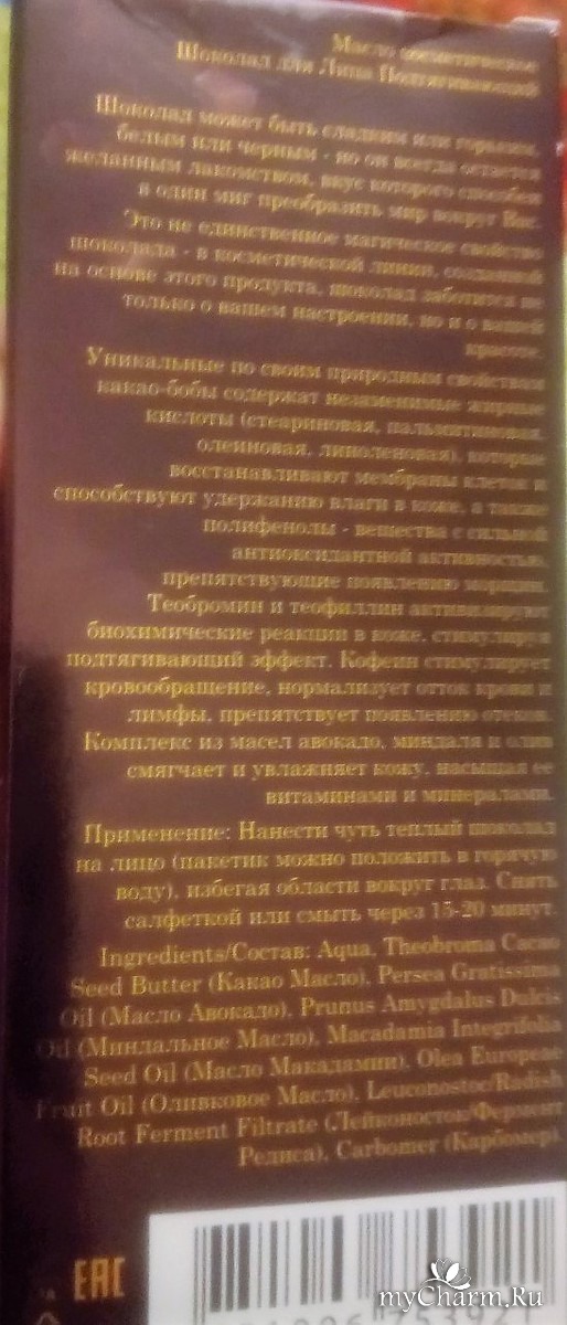 Состав/Ingredients: Aqua, Theobroma Cacao Seed Butter (Какао Масло), Persea Gratissima Oil (Масло Авокадо), Macadamia Integrifolia Seed Oil (Масло Макадамии), Prunus Amygdalus Dulcis Oil (Миндальное Масло), Olea Europeae Fruit Oil (Оливковое Масло), Carbomer, Sharomix.