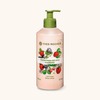 Молочко находится вот в такой прозрачной бутылочке из пластика с дозатором. С изображением красивой землянички.