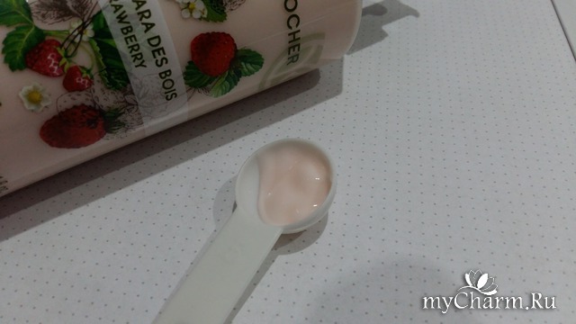 Молочко кремовой текстуры, нежного розового цвета. А какое оно ароматное, ммм, просто прелесть, так и хочется попробовать его на вкус)но делать этого конечно же не стоит)