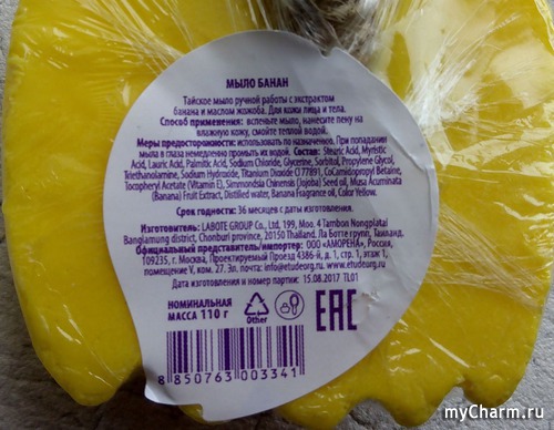 Бананы упакованы в пленку с этикеткой, на которой указана вся информация о производителе, составе и сроке годности. Привлекает внимание само описание: "Тайское мыло ручной работы с экстрактом банана и маслом жожоба". Сейчас вообще очень ценятся средства ручной работы, а уж с содержанием масел вообще как кладезь полезностей. Согласно этикетке использовать мыло можно для кожи лица и тела.