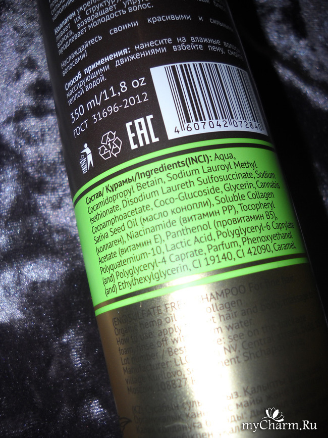 Состав у шампуня великолепный! Сульфатов, парабенов и силиконов в нем нет, зато он может похвастаться наличием пантенола и витаминов E и PP! Присутствующий в его составе коллаген помогает не только укрепить волосы по всей длине, продлить их молодость, вернуть им красивый блеск и упругость, но и восстановить их структуру, одновременно разглаживая поверхность каждого волоска. А масло конопли в составе эффективно устраняет повреждения, питает и увлажняет локоны, одновременно наполняя их изумительным сиянием и блеском, а также делает их на удивление шелковистыми и сильными!