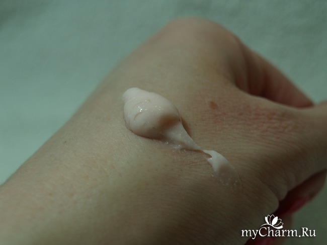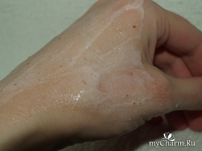 Само средство густое, слегка розоватого оттенка, еле-еле заметного. При распределении средства на коже видим что, в нем присутствуют небольшие скрабирующие частички.