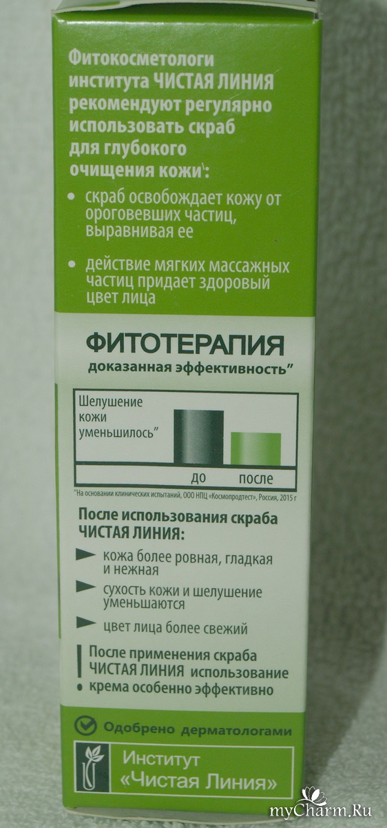 Наносить скраб необходимо на очищенную кожу лица, шеи и декольте. После использования скраба кожа становится гладкой, хорошо увлажненной и бархатистой. Как мне кажется, кожа немного подтягивается и цвет лица становится чуть равномернее и светлее. Такой эффект меня вполне устраивает поэтому пользуюсь скрабом с удовольствием. Аромат средства некоторое время после использования тоже чувствуется, так что я хожу и благоухаю. После применения скраба рекомендуется нанести и крем от Чистой линии, тогда результат будет намного эффективнее. Поскольку крема от Чистой линии у меня нет, то я пользуюсь имеющимися у меня. Хотя кожа после скраба и так приятно увлажненная, не сухая и не стянута.