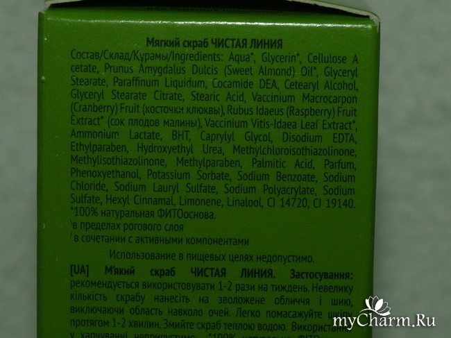 Состав указан на боковой стороне коробки. Активными натуральными компонентами скраба является сок малины и косточки клюквы. Сок малины действует на кожу успокаивающим образом, предотвращая различные раздражения кожи, а так же хорошо смягчает и питает кожу. А косточки клюквы деликатно и нежно очищают чувствительную кожу лица, не оставляя царапин и ранок.