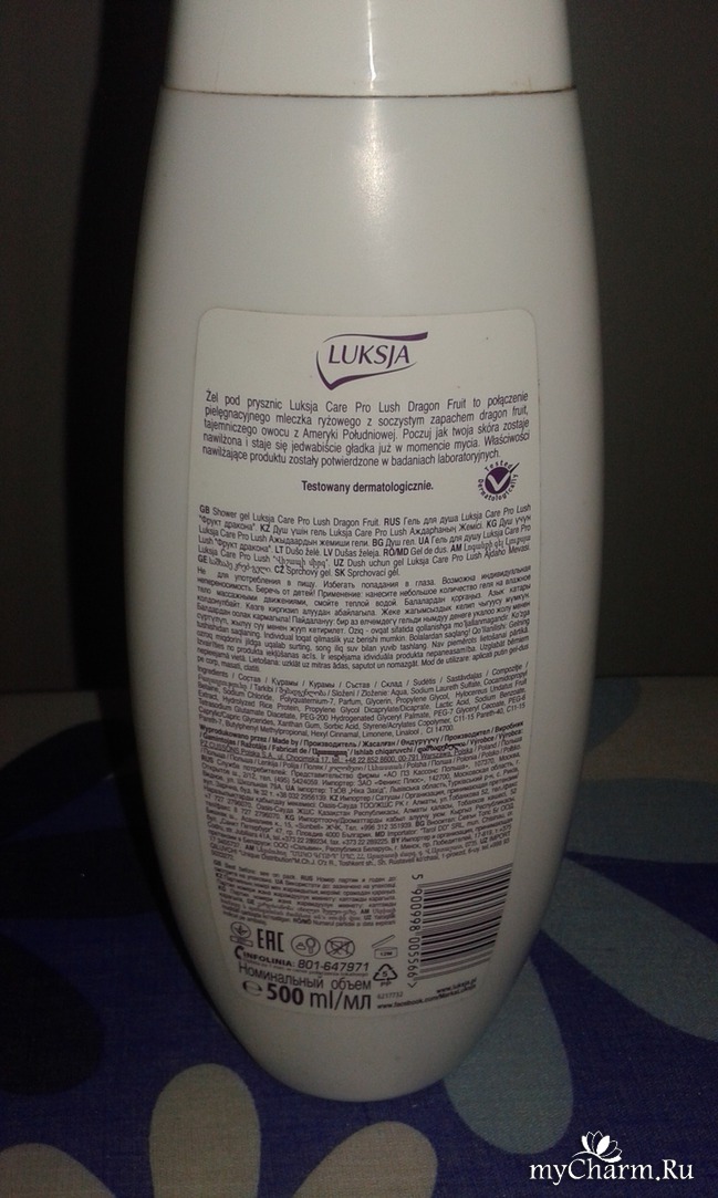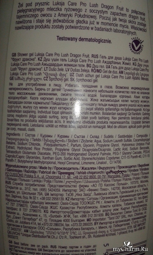 Перевернув гель с другой стороны, видим описание на нескольких языках, и на русском в том числе; состав, срок годности, объем геля для душа. Также указано, что продукт дерматологически протестирован.