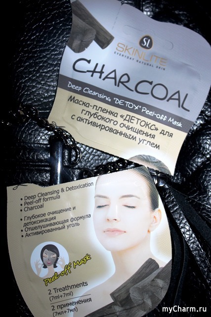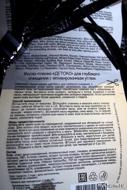 Маска-пленка «Детокс» для глубокого очищения с активированным углем. Представлена в стандартной форме саше на две порции 7 мл+ 7 мл. Пакетик оформлен в приятных медово-пастельных тонах с изображением древесных угольков. На обратной стороне имеется подробное описание на двух языках. Остановимся подробнее на русско-язычном составе.