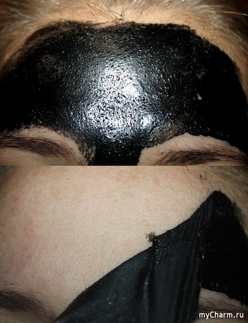 Разделенные саше имеют специальные риски для удобства открывания даже при условии, что нет под рукой ножниц. Это удобно и практично. Можно брать маску с собой в поездки и путешествия. Вот только сам процесс пусть будет интимным. Внешний вид маски никак не предусматривает демонстративного выхода «в свет». Черный гелеобразный состав наносится на очищенную кожу. При контакте он быстро загустевает, так что следует активно его распространять по лицу. Аромат вполне приятный, не яркий, сладковатый. На время выдержки маски (порядка 15-20 минут ( лучше прилечь. Маска подсыхает и превращается в пленку. Причем довольно плотную. Следует снимать её аккуратно снизу вверх. Обращаю внимание, что пленочка довольно крепко «держится» за кожу, так что при снятии кожа даже приподнимается. Но сам эффект очищения меня просто восхитил.