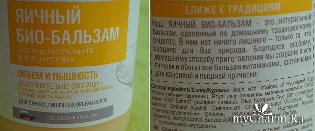 Сегодняшний бальзам – из этой серии. «Яичный био-бальзам», изготовленный на основе яичного протеина и созданный для придания пышности и объёма волосам. Несколько непривычная упаковка, напоминающая ностальгические бутылки с молоком и кефиром, которые продавались во времена СССР. Прозрачная бутылочка с плотно закручивающейся крышечкой. Сквозь прозрачную пластмассу просвечивает желто-оранжевая пудингообразная масса.