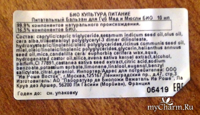 В аннотации к бальзаму производитель гарантирует полное отсутствие каких-либо искусственных ингредиентов, и позиционирует продукт под маркой ЭКО-продукции. На упаковке так и написано: 99,9% компонентов натурального происхождения и 16% компонентов - БИО-компоненты. При более тщательном рассмотрении натуральный состав подтвердился. В начале списка указан натуральный смягчитель, изготовленный из кокосового масла (Capric Triglyceride), затем по списку следует кунжутное масло (Sesamum Indicum Seed Oil), также использованы другие растительные масла (olus oil), воск, (Cera Alba), химические связующие компоненты, клещевинное масло (ricinus communis seed oil), экстракт овса (avena sativa kernel extract), касторовое масло и мед.