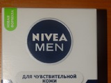 На лицевой стороне имеется логотип Nivea Men. Кроме того, там же расположено название продукта и пометка "для чувствительной кожи".