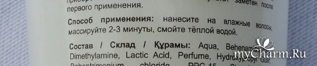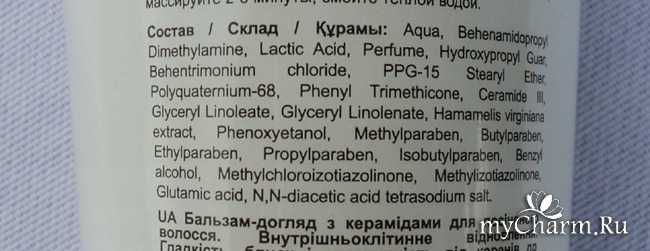 Судя по составу, бальзам реально должен очень хорошо разглаживать волосы. Молочная кислота, триметикон (вид силикона), керамид, глутаминовая кислота (аминокислота), экстракт гамамелиса. Но, к сожалению, вперемешку с этими компонентами есть и не очень приятные: отдушка в начале списка, 5 (!) видов парабенов, спирт.Такой вот состав.