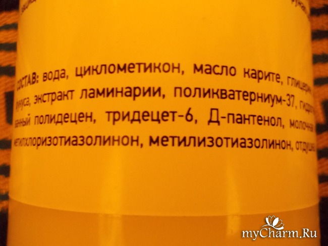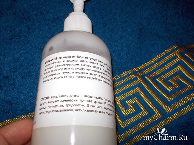 В бальзаме присутствует масло карите, экстракт фукуса, экстракт ламинарии, Д-пантенол. Для волос масло карите и водоросли предоставляют лучший уход. В них много витаминов, микроэлементов и жирных кислот. Они хорошо справляются с ломкими, сухими волосами; с их выпадением, с перхотью. Но также прекрасны эти компоненты в применении для жирных и нормальных, и даже здоровых волос.