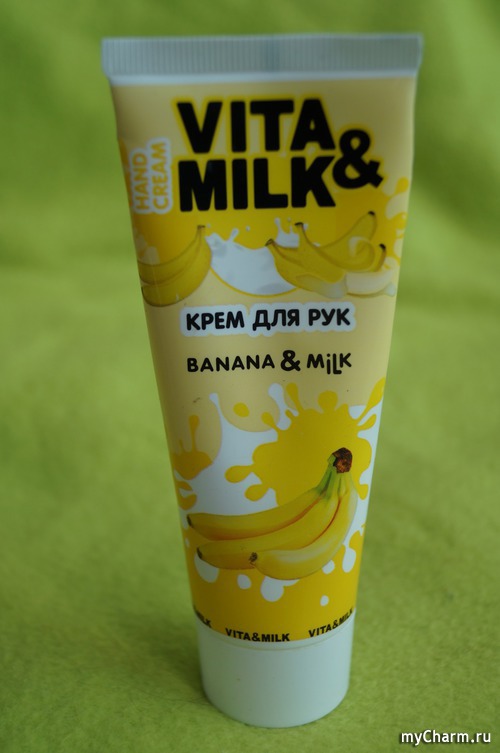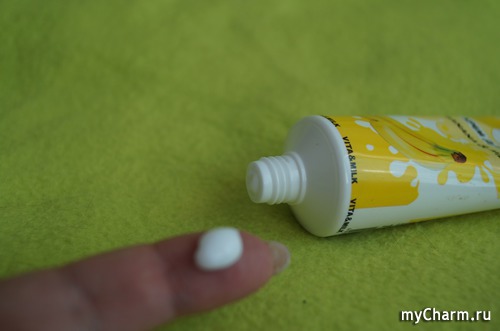 Яркая жизнерадостная туба из мягкого пластика с плотно закручивающейся крышечкой. Крем удобно ставится на крышечку, ничего не течёт. Текстура крема нежная, белого цвета, не жидкая. Изумительный запах свежих бананов, ну просто реальных бананов! Тюбик довольно увесистый - 75 мл, хватит надолго.