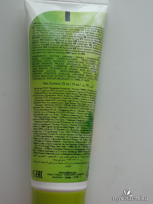 Внизу - адрес сайта фирмы Oriflame и информация о том, где крем изготовлен. В данном случае: "Made in Poland".