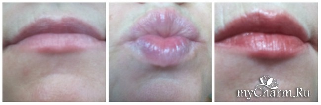 Сам бальзам для губ бесцветный. Но я нашла ему еще одно применение. У меня есть одна очень сухая помада, и я стала наносить ее поверх данного бальзама. Результат меня порадовал. Помада не растекается, и в то же время чувствуется, что губы увлажнены.