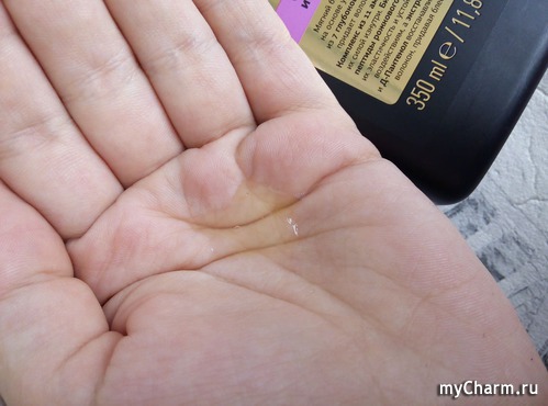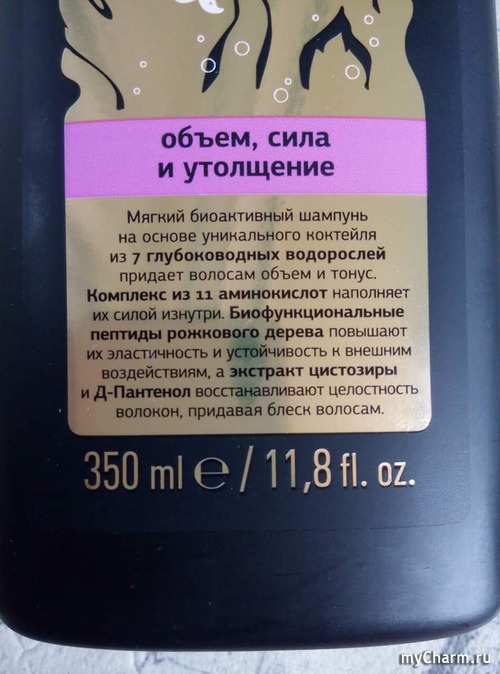 Флакон черного цвета с яркими надписями оказался достаточно большим, 350 мл. Упаковка непрозрачная, смотрится очень стильно и строго. Золотая крышечка и надписи добавляют намек на роскошь, намекая на уход за волосами самого высокого уровня.