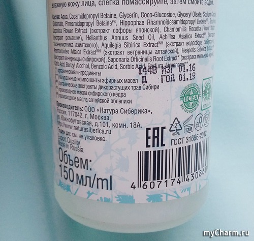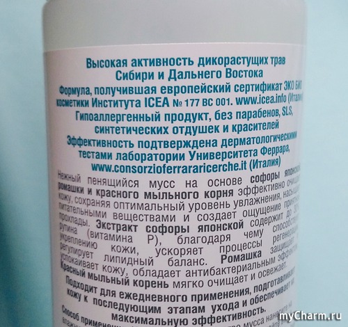 Бренд позиционирует себя как производителя натуральной косметики. Водные и масляные экстракты, используемые в средствах, производятся на заводе компании из трав и ягод, растущих в Сибири и на Дальнем Востоке. На сайте бренда можно ознакомиться с различными эко-сертификатами на продукцию. Вот и данное средство, если верить заявлению производителя, на 99% натуральное. В составе, на мой взгляд, нет ничего криминального, отсутствуют сульфаты, силиконы, парабены.