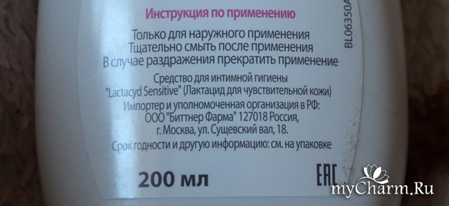 Инструкция, конечно, так себе, но не думаю, что у кого-то возникнут сложности в использовании средства для интимной гигиены. Как видите, флакон имеет объем в 200 мл - так вот, этого хватает ооочень надолго. Одного нажатия (а средство как раз с дозатором) более, чем достаточно. И я хоть и использую этот гель каждый день, уже даже и не вспомню, когда купила это средство - вот, как это было давно.