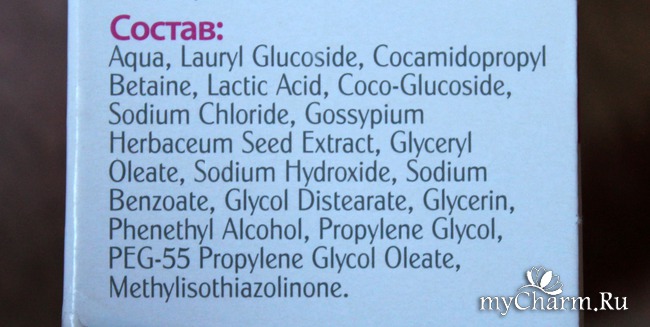 Итак, для себя я решила, что формулировкой про мыло производитель хотел сказать, что в составе нет сульфатов. И, в принципе, так оно и есть! Этот список, конечно, не состоит из одних только натуральных ингредиентов, но всё-таки мы ведем разговор не про эко-продукт, а потому такой состав я считаю вполне приемлемым. Тем более, заявленные молочная кислота и экстракт хлопка находятся не в конце списка, а на почетных местах. Они обладают успокаивающим, защитным и регенерирующим действием, что обеспечивает бережное очищение каждый день.