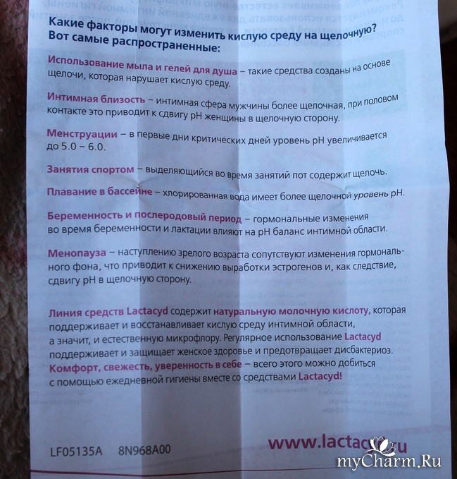Очень удобно и продуманно. Особенно, когда понимаешь, что в коробке также прячется целый лист с цветным и красочным текстом. На этой листовке Лактацид рассказывает нам, зачем вообще нужны средства для интимной гигиены. Ведь кто-то использует для этих целей обычное мыло или гель, что делать, на самом деле, не стоит.