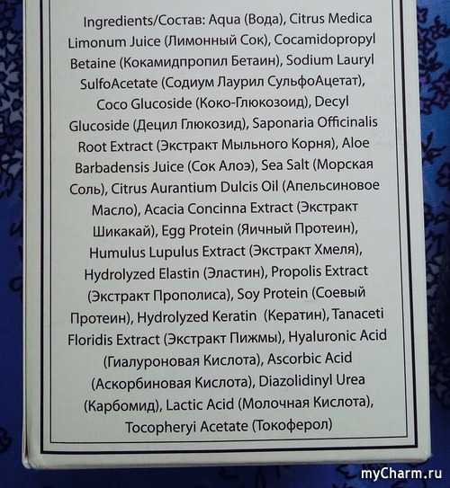 В общем, при использовании шампуня, на волосах работает целый комплекс активных компонентов. Например, морская соль очищает и отшелушивает кожу головы, улучшает кровообращение, а так же борется с повышенной жирностью волос. Следом сок алоэ успокаивает и увлажняет кожу, восстанавливает и укрепляет волосы. Яичный протеин обеспечивает питание и восстановление структуры волос. Экстракт шикакай укрепляет волосяные луковицы и ускоряет рост волос. Это растение содержит комплекс витаминов и природных элементов, необходимых для красоты и здоровья волос. В списке даже значатся эластин и гиалуроновая кислота! При этом в составе отсутствуют SLS и SLES.