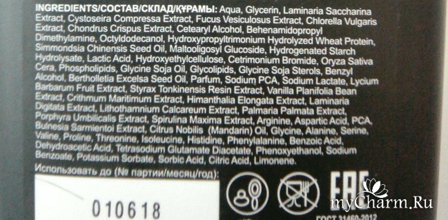 Флакон выполнен в элегантном стиле, чёрного цвета, но при этом с небольшим милым изображением водорослей в пузырьках и маленькой медузки.На этикетке с лицевой стороны, дана главная информация о том, какие компоненты входят в состав и что продукт не содержит SLS/SLES, MEA,DEA,TEA,GMO,PEG/PPG -словом, всяких "неполезностей".