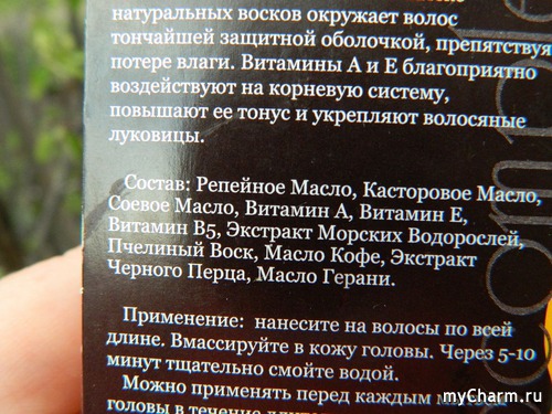 В упаковке находится один пакетик с жёлтым «золотом» для волос – ценным маслом, которое восстанавливает структуру волос, уделяя особую заботу их кончикам и предупреждая сечение. Для решения столь серьёзных задач в пакетике собрана целая «армия» полезных компонентов: репейное, касторовое и соевое масла – этакая «тяжёлая артиллерия», которая, к тому же, способствует и укреплению волос.