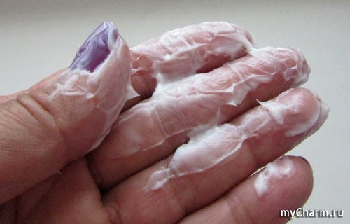 Наносить легко, на руках ощущение мягкости. Смывается с ладоней легко.