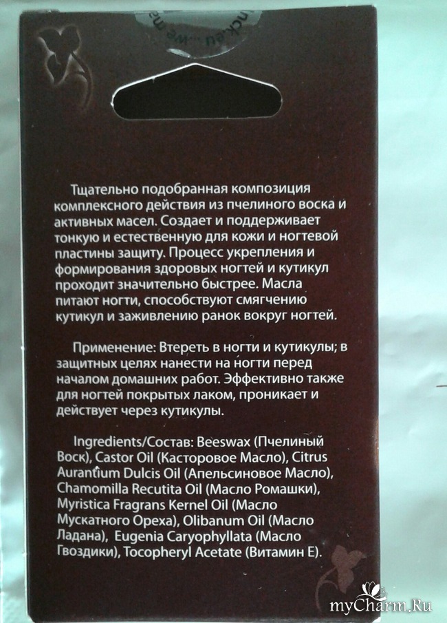 На лицевой стороне видим лишь название бренда и самого продукта, а вот на обратной стороне содержатся уже более подробные детали: описание, применение, состав Укрепляющего Биовоска для ногтей.