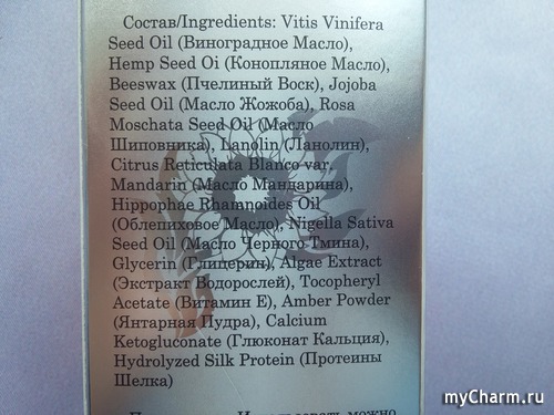В составе воска очень большое количество масел, экстракт водорослей, витамины, протеины. А также: