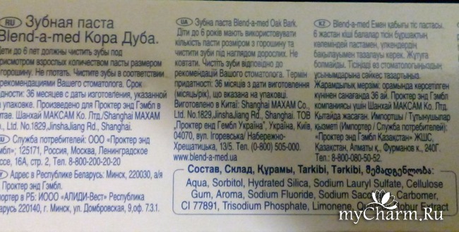 Состав продукта. Состав зубной пасты Blend-a-med Кора Дуба вполне типичен для таких же продуктов среднего класса стоимости. Здесь есть биоактивный фтор и система кальци-стат, помогающая кальцию проникать вглубь зубов, укрепляя их и защищая от зловредного кариеса. Кора дуба присутствует только в конце списка, больше травяных экстрактов в составе продукта я не наблюдаю, а жаль!!!