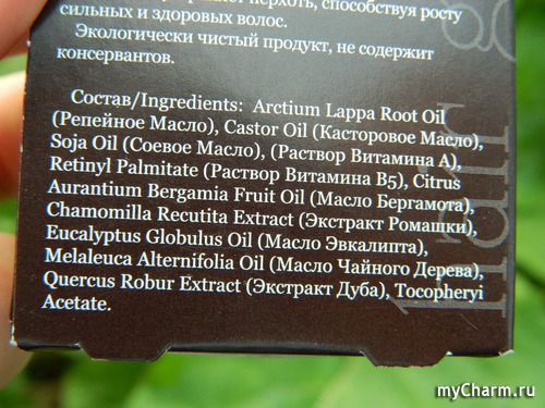 Состав вызывает несомненное доверие: компоненты, входящие в него, на сто процентов натуральны и полезны. Несколько масел – репейное, касторовое, соевое, бергамота, эвкалипта и чайное. Первые два из них славятся тем, что способствуют росту волос. А вместе с соевым они ещё и восстанавливают структуру волоса, как бы ламинируют волосы. Масло бергамота, эвкалипта и чайное обладают антибактериальным действием, укрепляют волосяные фолликулы, придают волосам эластичность, шелковистость и блеск.