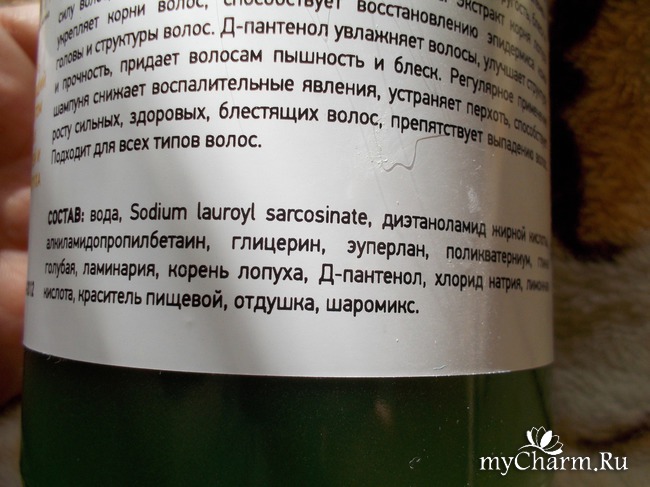 В наш шампунь входят натуральные ингредиенты такие, как ламинария, корень лопуха, голубая глина, Д-пантенол.