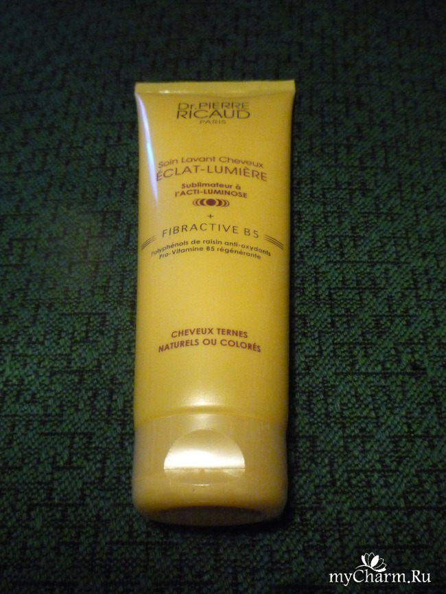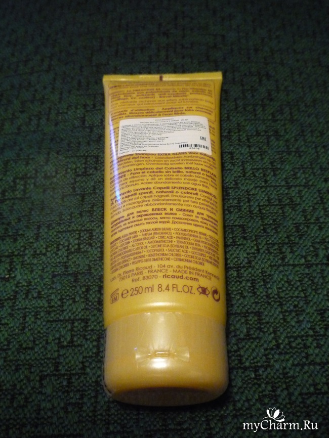 Тюбик не имеет картонной коробочки, в которую обычно упаковывают кремы, никакой инструкции поэтому к нему не приложено. Когда я вынула его из посылки, мне понравилось, что его крышечка защищена специальной плёночкой, которая исключает случайное протекание шампуня. Произвёл хорошее впечатление дизайн тюбика - однотонный по цвету, желтоватый с перламутровым отливом, лаконичное оформление, надписи на поверхности тюбика коричневые и золотистые. Объём тюбика довольно большой - 250 мл, тяжёлый на ощупь, заполнен целиком, при встряхивании не булькает. На упаковке надпись MADE IN FRANCE - сделано во Франции. Остальные надписи сделаны на французском, но есть и на русском языке. А также приклеена белая этикеточка с русским текстом, где написано, что в его состав входит ключевой компонент Acti-luminose, который обволакивает кутикулы волокон волоса для лучшего отражения света. Комплекс Fibrative 5 содержит Pro-Vitamine B 5, полученный из полифенолов винограда - экстрактов сорта "Чёрный пино", известных своими мощными антиоксидантными и защитными свойствами. Это настоящая восстанавливающая эссенция для эффекта ослепительного блеска и сияния волос.