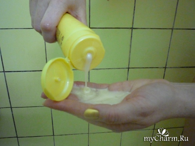 Нанесла шампунь на влажные волосы, распределила по всей длина, помассировала (как рекомендуют на этикетке) пальцами голову, смыла. Повторила процедуру ещё раз - нанесла ещё одну порцию, уже поменьше объёмом на сырые волосы, шампунь пенится сильнее, распределила пену, помассировала и оставила на несколько минут шампунь на волосах, затем смыла, тщательно промыла волосы тёплой водой.