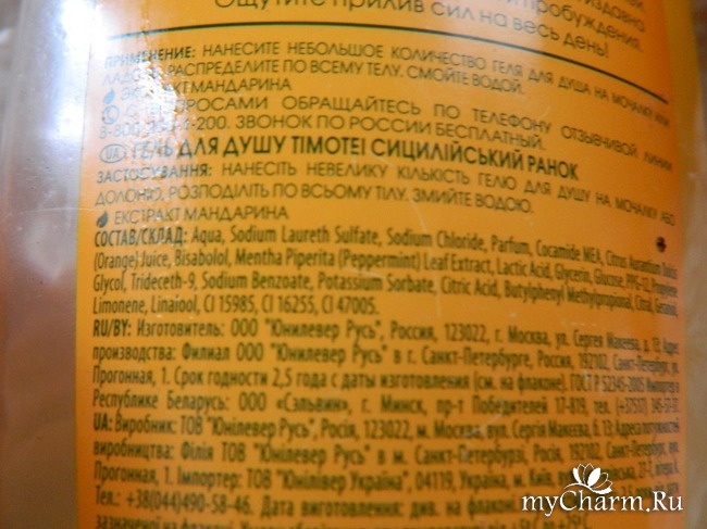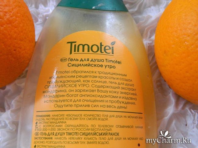Гель для душа Сицилийское утро от Timotei – неплохое средство для принятия водных процедур, особенно по утрам, поскольку яркий аромат мандарина помогает прогнать остатки сна, взбодриться и настроиться на рабочий день. После принятия душа чувствуешь себя полным сил и энергии.