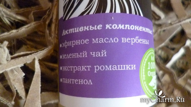 Основные компоненты, вокруг которых строится состав? представляют собой ароматный квартет для красивой свежести нашего личика: эфирное масло вербены, зеленый чай, экстракт ромашки и пантенол.