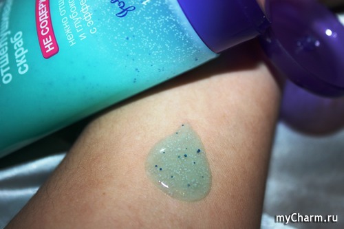 По консистенции гель немного жидковат, но внешне довольно симпатичный. Полупрозрачный, нежно-голубого оттенка, он наполнен миллионами микрогранул: синие чуть больше, белые чуть меньше. Они словно звездочки, рассыпавшиеся в космическом пространстве млечного пути. Используется средство вполне экономично, потому как легко распределяется и хорошо скользит по поверхности кожи.