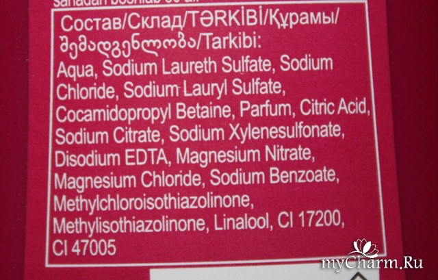 На обратной стороне на этикетке представлен состав. Он полностью основан на химических элементах: лауретсульфата натрий, хлористый натрий, лаурилсульфат натрия, кокамидопропилбетаин, Parfum, лимонная кислота, цитрат натрия, ксилолсульфонат натрия, динатрия ЭДТА, нитрат магния, хлорид магния, бензоат натрия, метилхлоризотиазолинон, линалоол, CI 17200, CI 47005.