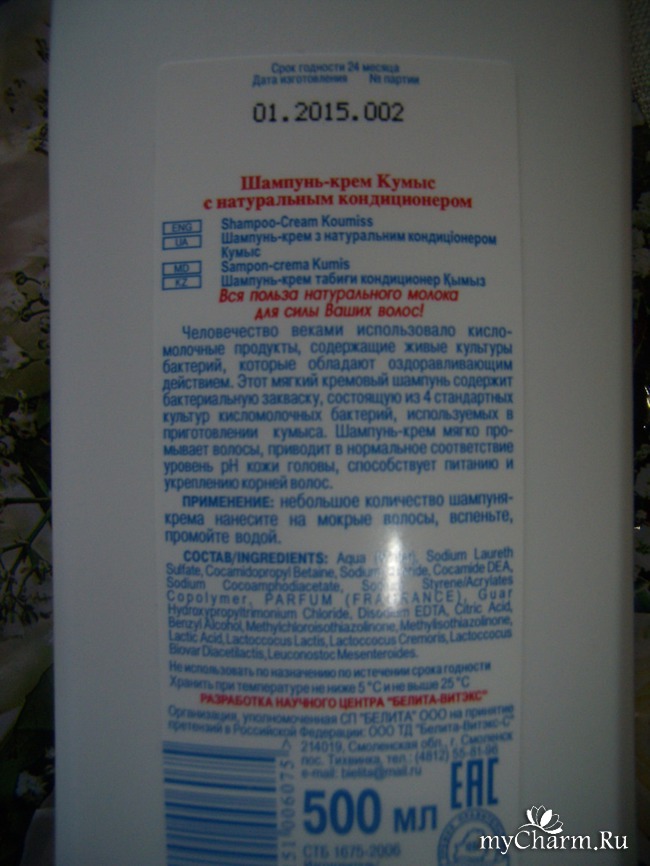 Большая представительная бутылка в 500 мл белого цвета, нежные оттенки на «фасаде» и приятный аромат + небольшая цена (около 80 рублей) меня подкупили – и я, разбалованная недорогими и удовлетворяющими меня косметическими средствами от белорусского бренда, купила этот шампунь. И … разочаровалась уже после пары применений! Хотя для чистоты эксперимента я честно пользовалась им около двух недель – но больше не выдержала.