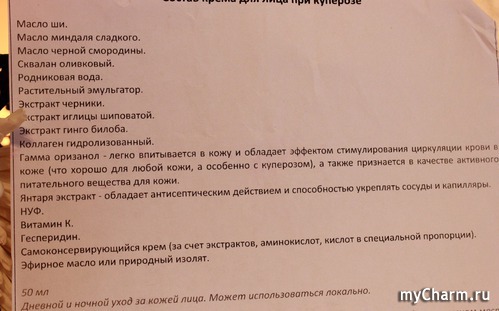Состав крема для лица "При куперозе" от бренда "KremDoma" без ложной скромности можно назвать шикарнейшим.