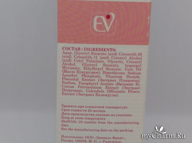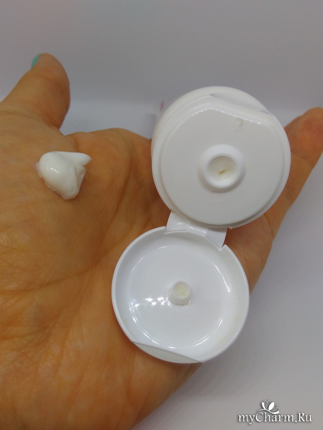 Средство белого цвета, довольно плотное. На коже распределяется быстро, будто тает: даже не верится, что такой плотный крем может так быстро впитаться в кожу. На лицо мне достаточно объема с горошину, не более: в таком случае на коже не остается ни единого намека на жирный блеск. Аромат крема тонкий, нежный, схожий с ароматом роликового геля Evinal, о котором недавно рассказывала.