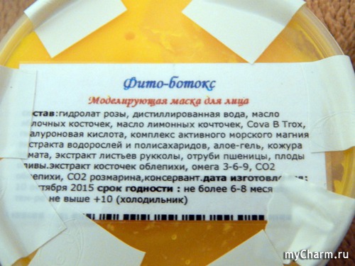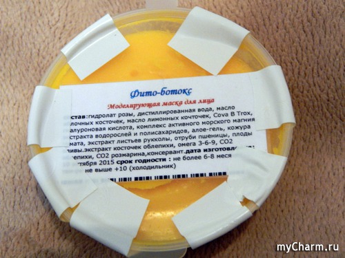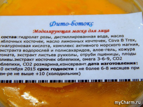 Состав фито-маски просто восхитителен: комплекс активного морского магния, экстракта водорослей и полисахаридов, гиалуроновая кислота, алое-гель, комплекс антиоксидантов для кожи- кожура томата, экстракт листьев рукколы, отруби пшеницы, плоды оливы, экстракт косточек облепихи, омега 3-6-9 (полиненасыщенные жирные кислоты).