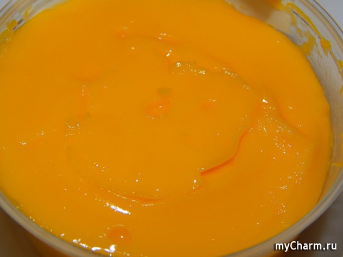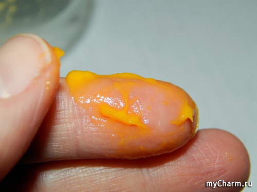 Маска представляет собой густую ярко-оранжевую массу, по консистенции похожую на очень густой йогурт или даже желе. Запах чуть уловимый приятный.