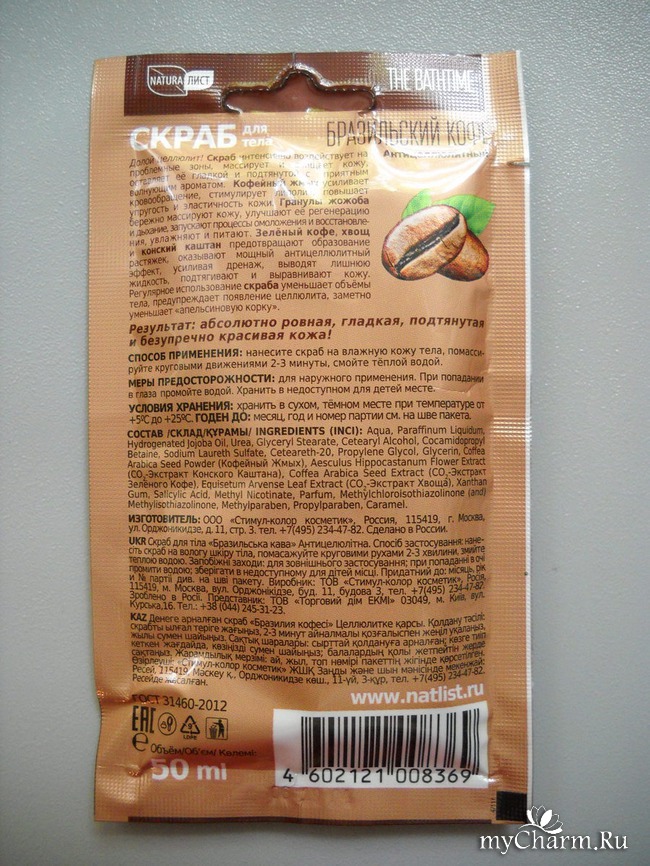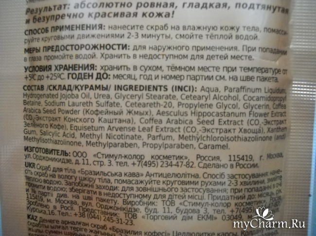 А чтобы чарующий кофейный аромат скраба не вводил потребителей в заблуждение, производитель отметил, что скраб предназначен лишь для наружного применения. Хранить же его следует подальше от детских глаз, в достаточно темном и относительно сухом местечке, при температуре от пяти до двадцати пяти градусов.